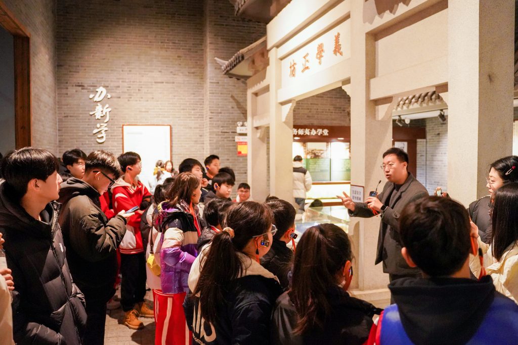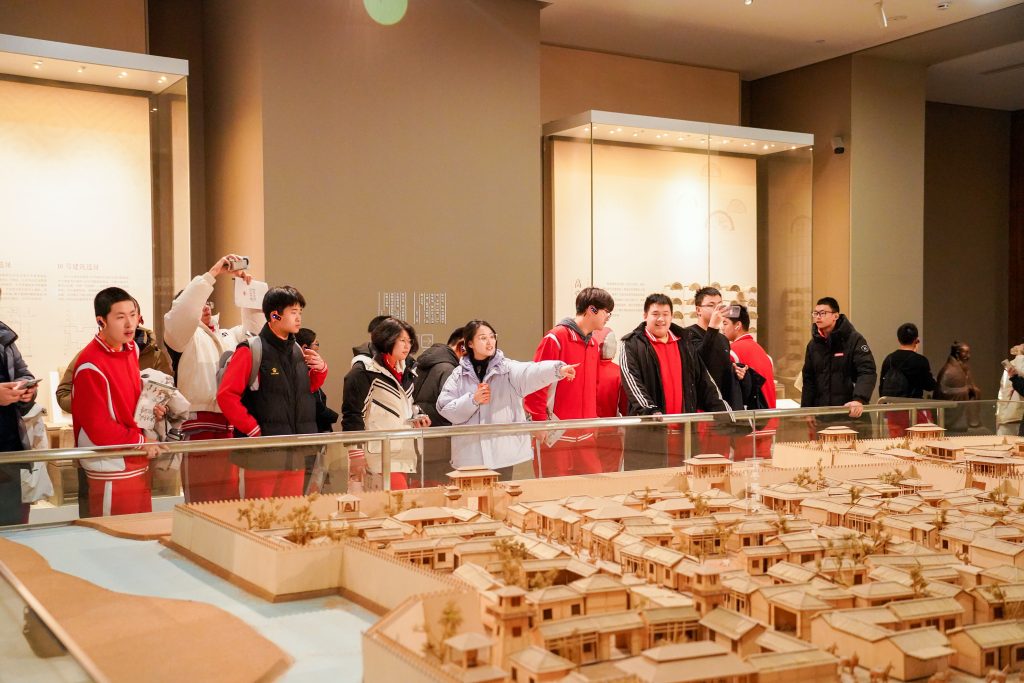 穿越千年 博览齐都风华 研学首日,同学们首先抵达齐文化博物馆。这座宏伟的建筑犹如一部立体的史书,静静述说着齐国八百年的兴衰历程。从姜太公封齐到桓公称霸,从稷下学宫的百家争鸣到临淄城的繁华盛景,同学们沉浸于历史长河,通过珍贵文物与复原场景,将课本知识化为真切体验。随后,大家又走进中国课本博物馆感悟知识传承的脉络,走进足球博物馆探寻蹴鞠起源的奥秘,最后登上海岱楼,凭栏览尽城市风貌,为首日研学留下了深刻记忆。